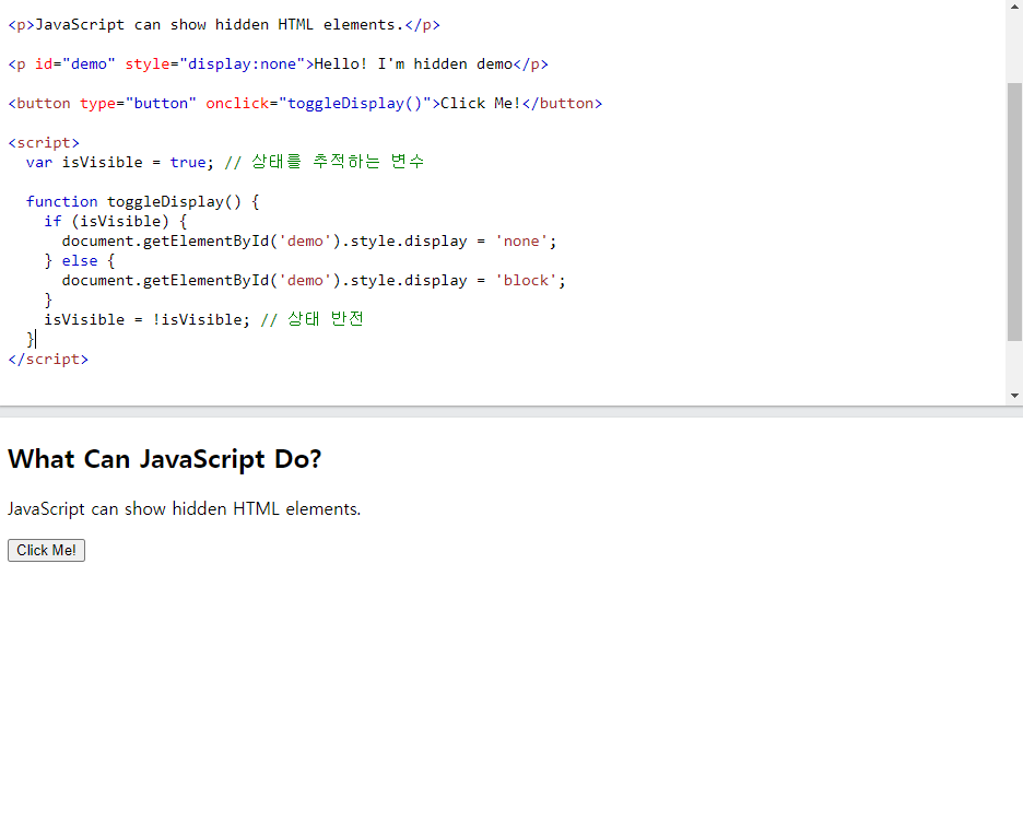 - toggleDisplay 함수는 버튼 클릭 시 호출됩니다. 이 함수는 isVisible의 상태에 따라 요소를 숨기거나 보이게 합니다.